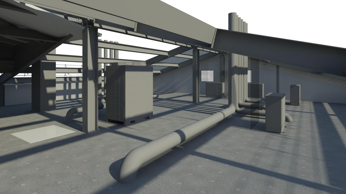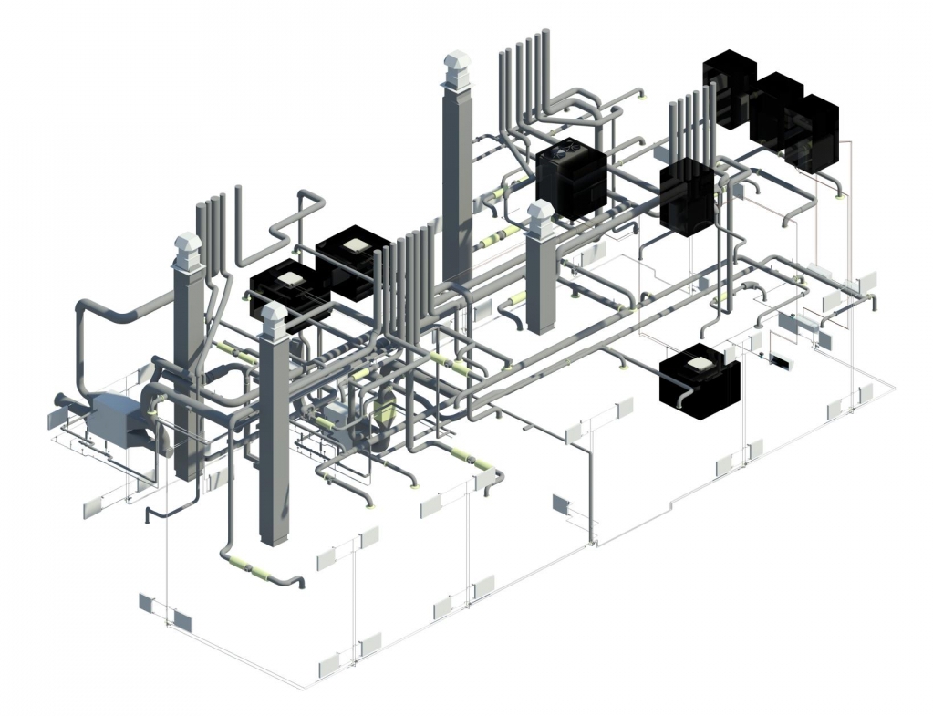 When designing buildings with industrial premises, where significant heat is generated, and with offices, air-conditioning systems with variable refrigerant flow are provided, thanks to this solution, the system simultaneously works on cooling and on space heating, depending on needs. In this case, it is possible to utilize excess heat from air conditioning systems to a hot water system or a floor heating system. When designing the section “Heating, ventilation and air conditioning”, the method of information modeling of buildings based on the AutodeskRevit software package has been successfully applied.